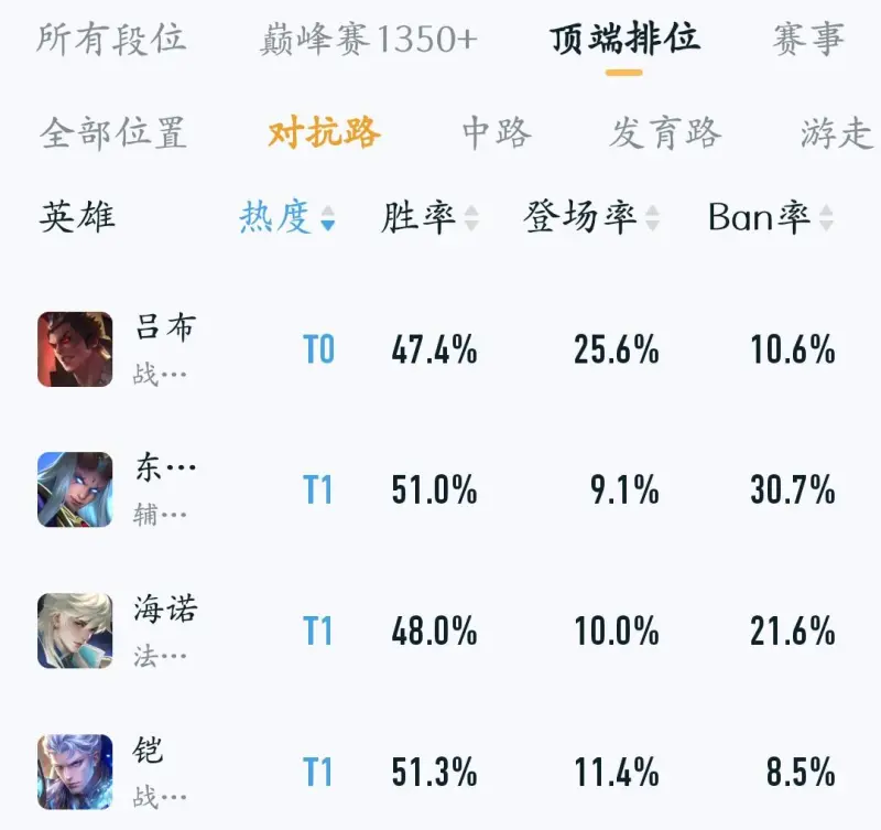 上分的时候习惯看一下英雄的胜率,顶端排位赛吕布又是断层的火,这个英雄到底有什么魅力?论胜率的话铠或者是东皇不香吗?而吕布胜率不高,但是出场率却没低过,真是让人好奇!