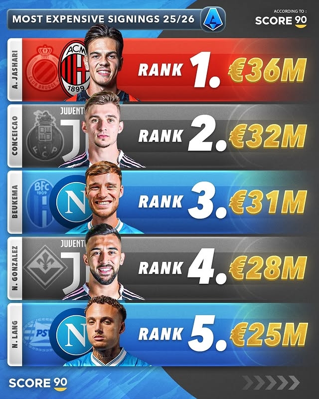 今夏意甲五大重磅转会:AC米兰3600万欧元引进亚沙里登顶,尤文图斯与那不勒斯各占两席